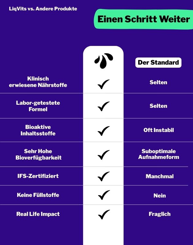 Fit, Gesund und voller Energie durch den Tag? Das geht jetzt Super Einfach - mit LiqVits! Laborgeprüfte Vitamine und Nährstoffe nahezu OHNE GESCHMACK, flüssig und hoch-funktional kannst Du LiqVits mit allem mischen: Dein Lieblings-Getränk, Smoothie, Porridge oder sogar in dein Essen. Mit LiqVits entscheidest Du, wie Gesund* schmeckt!